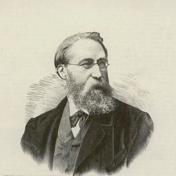 Brystbilde, kroppen en face, hodet 1/2 høyre profil. Kort, glatt hår skilt på venstre side. Fullskjegg. Briller med smal innfatning. Langt, smalt ansikt. Kledd i tidens drakt.