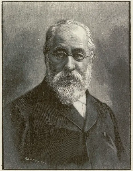 brystbilde, kroppen 1/2 høyre profil, hodet en face med dreining til høyre. Delvis skallet isse, kort, glatt hår. Fullskjegg. Briller med smal innfatning. Langt, smalt ansikt. Kledd i tidens drakt.