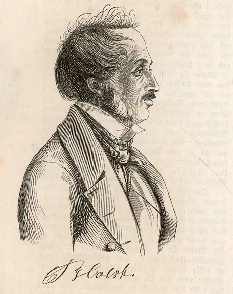 Brystbilde, hel høyre profil. Fremoverbørstet hår, kinnskjegg og mustasje. Utstående underleppe. Kledd i tidens drakt.