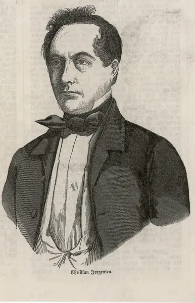Brystbilde, 1/4 vesntre profil. Kort, fremoverbørstet hår, som står opp i en kam midt på hodet. Glattbarbert, buet panne, utstående munn. Kledd i tidens drakt.