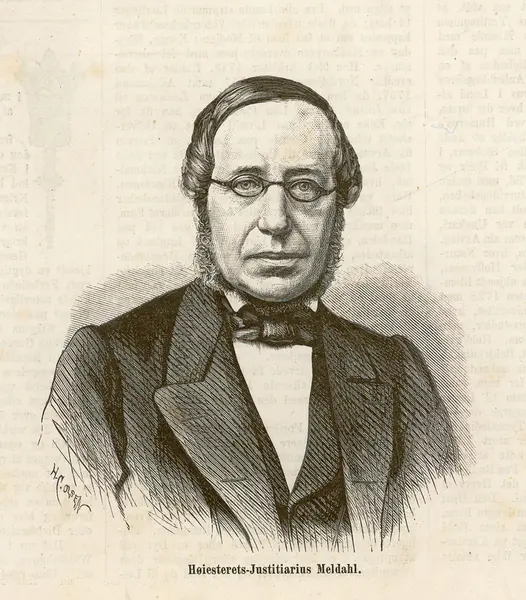 Brystbilde, en face med liten dreining til høyre. Glatt hår skilt på høyre side, kinnskjegg. Briller. Bred munn. Kledd i tidens drakt.