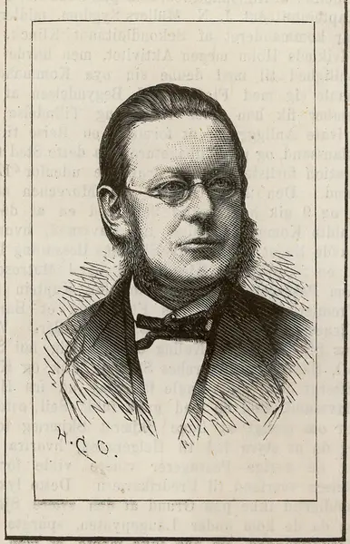 Brystbilde, kroppen en face, hodet 1/4 høyre profil. Glatt bakoverstrøket hår, kinnskjegg. Briller med smal innfatning. Store ører. Kledd i tidens drakt.