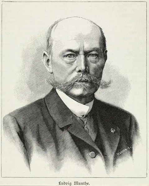 Brystbilde, 1/8 høyre profil. Skallet isse med hårkrans. Stor mustasje og et lite fippskjegg. Store ører, poser under øynene. Kledd i tidens drakt.