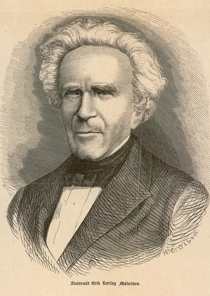 Brystbilde, 1/4 venstre profil. Stort, bakoverstrøket hår, glattbarbert. Høy, rund panne, dyptliggende øyne, lang overleppe og hake. Kledd i tidens drakt.