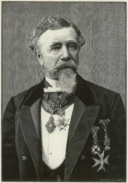 Brystbilde, kroppen en face, hodet 1/8 høyre profil. Kort, krøllet hår, snurrebart og fippskjegg. Kledd i selskapsdrakt med to ordener hengende om halsen, en krasjan og to ordener på brystet.