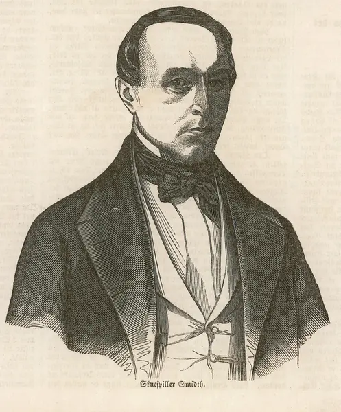 Brystbilde, 1/2 høyre profil. Kort, glatt hår skilt på venstre side. Skarpskårent, smalt ansikt. Kledd i tidens drakt.