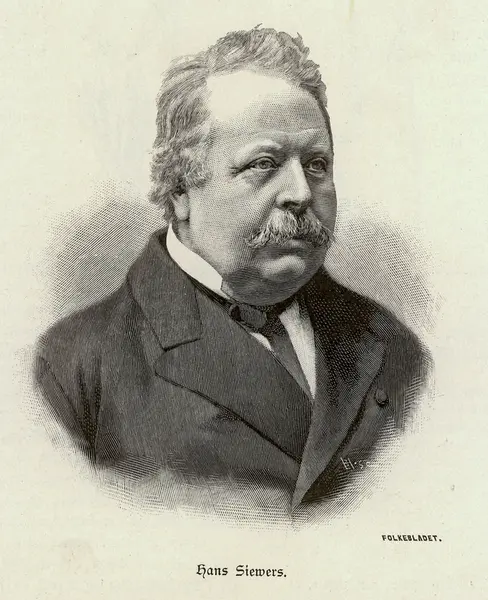 Brystbilde, 1/2 høyre profil. Bustete, oppstående hår, stor hvalrossmustasje. Fyldig ansikt med dbbelthake. Kledd i tidens drakt.