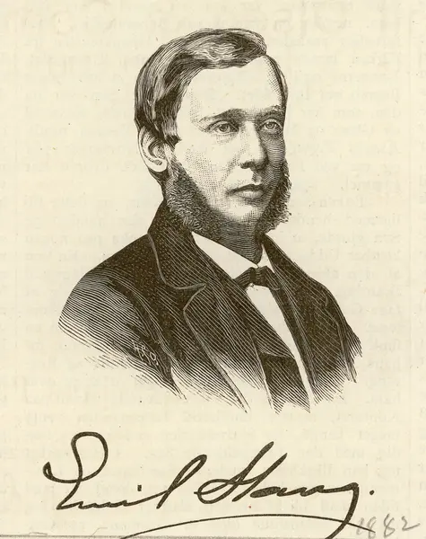 Brystbilde, 1/2 høyre profil. Glatt hår litt nedover ørene, kinnskjegg. Svak hake. Kledd i tidens drakt.
