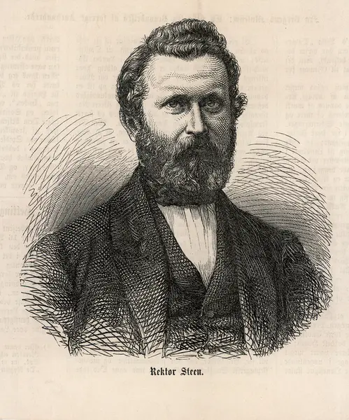 Brystbilde, en face med liten dreining til høyre. Krøllet hår skilt på venstre side, fullskjegg. Kledd i tidens drakt.