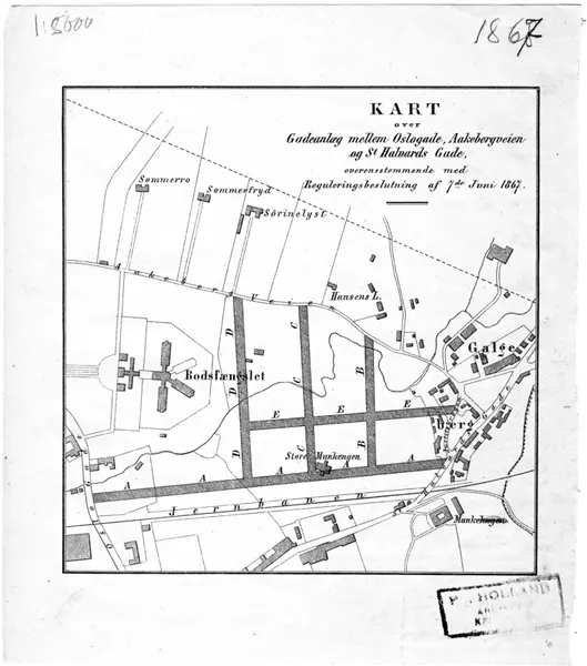 Kart over Gadeanlæg mellem Oslogade, Aakebergveien og St. Halvards Gade overensstemmende med Reguleringsbeslutning af 7de Juni 1867.