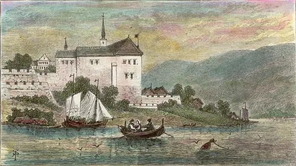 festning, slott, fjord, vik, robåt, roere, seilbåt, landskap, ås