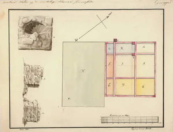 plan, arkitekttegning, målestokk, murblokker, kloster, ruiner,