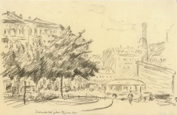 by, plass, bymiljø, løvtre, trafikk, bygårder