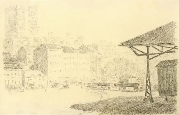 lagerskur, jernbanelinje, bymiljø, bygårder, plass, rådhus