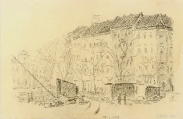 plass, park, arbeidsbrakke, kran, arbeidere, bygårder, bymiljø