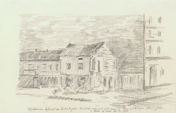 Bogstadveien hjörnet av Industrigaten. En 150 år gammel gård som er kommet tilsyne efterat gården foran er revet. 28-2-1932.