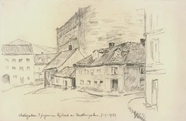 Skolegaten. I forgrunnen hjörnet av Mellemgaten. 7-2-1932