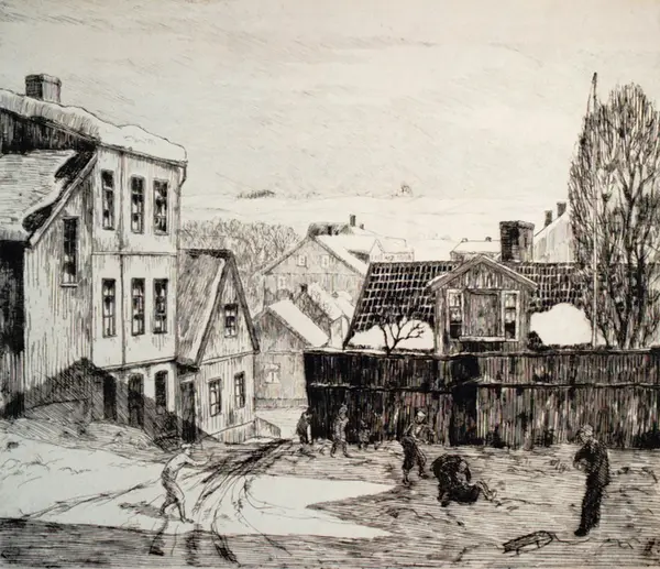 arkitektur, gateparti, vinter, bygård, byhus, trehus, bebyggelse, bakke, trær