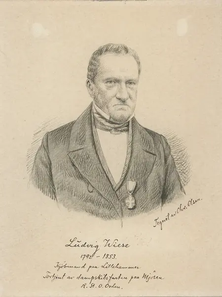 Tegnet av Chr. Olsen. (under motivet:) Ludvig Wiese / 1792-1853. / Kjöbmand paa Lillehammer / Fortjent av danpskibsfarten paa Mjösen. / R. St. O. Orden.
