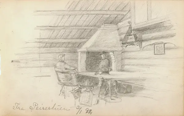 interiør, peisestue, peis, mennekser, bord, stoler, tømmervegger