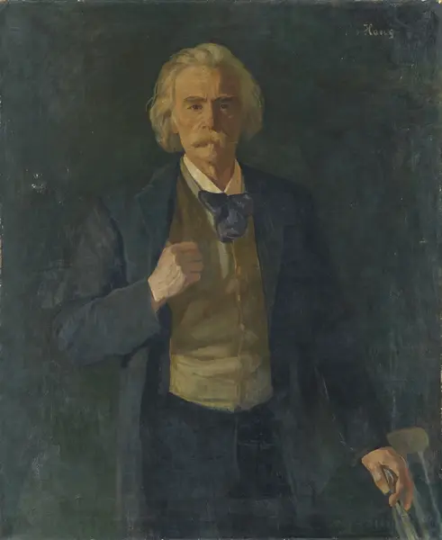 Beskrivelse: 3/4 figur en face v. hånd på ryggen av en pinne- stol h. hånd i vestens armringning. Grått hår og bart. Hvit skjorte sort sløyfe beige vest sort bukse grå frakk. Mørk bakgrunn.