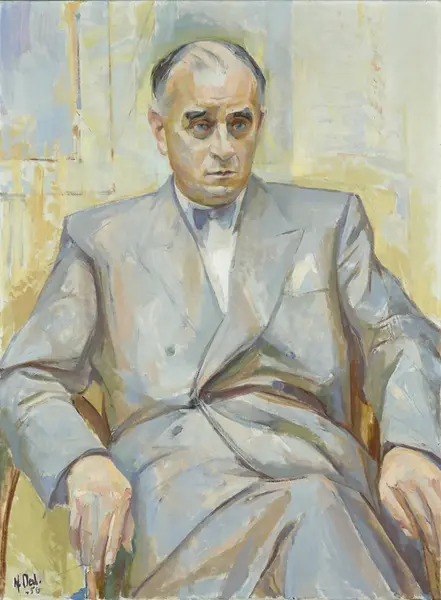 Beskrivelse: Sittende 3/4 figur 3/4 profil th begge hender på armlener av stol grå dress hvit skjorte blå sløyfe. Lys bak- grunn.