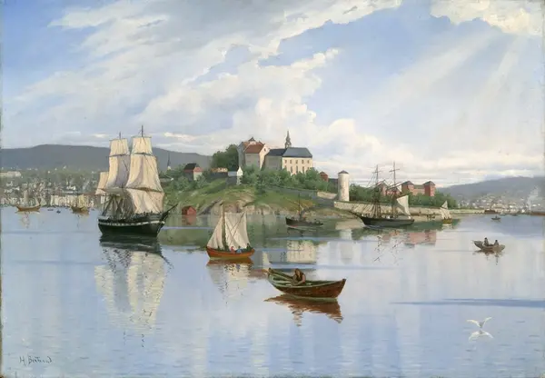 Beskrivelse: Akershus sett fra sjøen fra syd. I forgrunnen tv en seilskute for fulle seil th under Akershus en seilskute med revet seil. Ellers på sjøen en del småbåter med og uten seil. Th for Akershus ses bygningen til Hovedarsenalet.