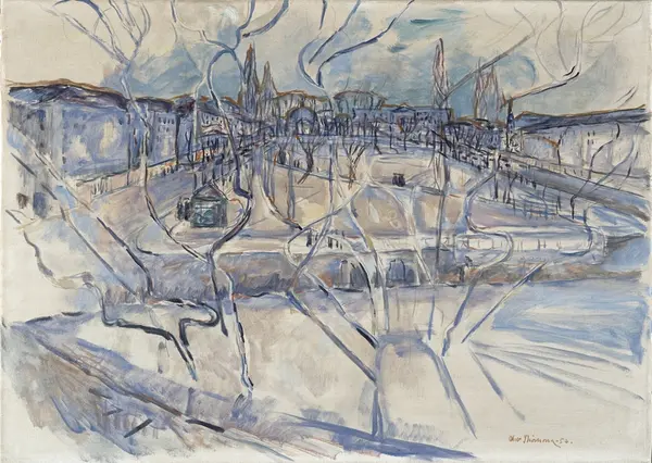 Beskrivelse: Skissemessig fremstilling av Studenterlunden. I forgrunnen antydes nakne trær. Langs begge sider husrekker. I bakgrunnen Nationaltheatret og Slottet.