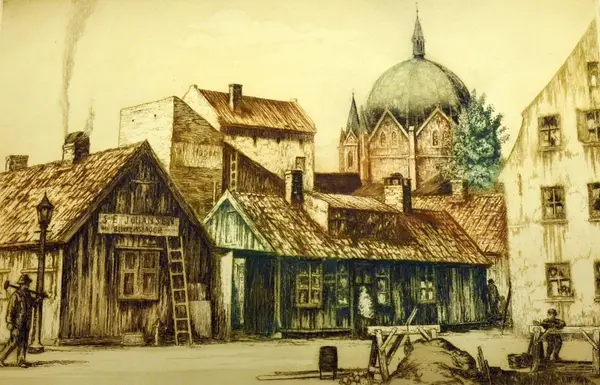 arkitektur, små trehus, murhus, kirke, veiarbeid, arbeidere, gateløp