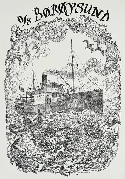 Dampskip Sjø fisker og robåt i forgrunnen fugler