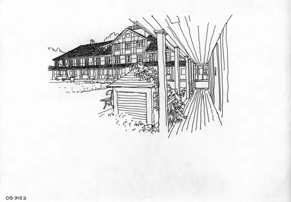 gård med svalgang, bindingsverk, gårdsplass, bil, luftehus