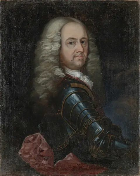 Mann med lang parykk, iført rustning Far til Karen Bolette Juell. Gift med Christian Juell. F. 1/1-1752 skrevet bak pålerretet.