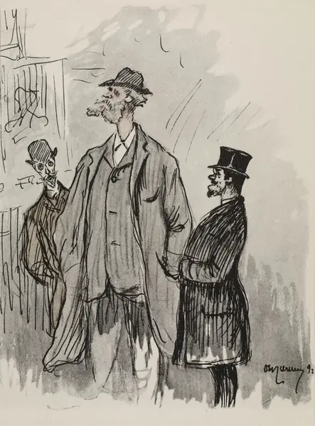 Gruppeportrett, karikatur, helfigur, hodeplagg, tobakksrøyking, frakk, kunstere, sogneprest