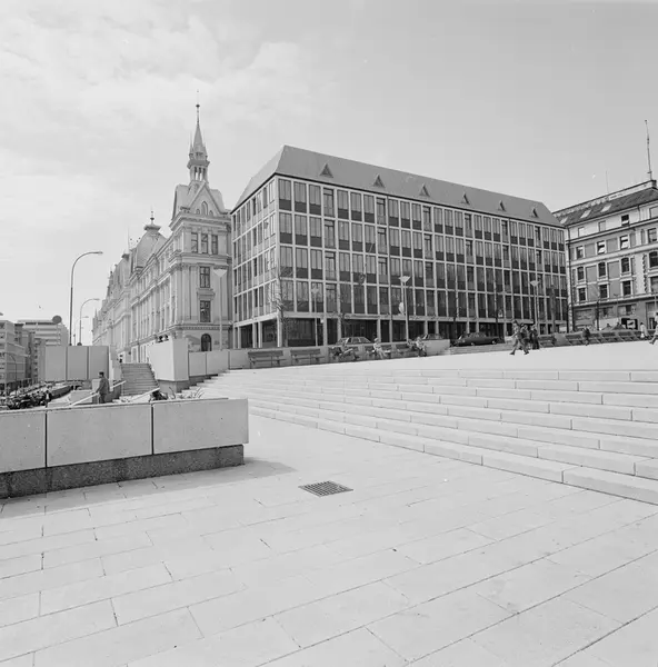 plass, trapper, benker, mennesker, biler, kontorbygninger Utenriksdepartementet, Victoria terrasse, Vikaterrassen