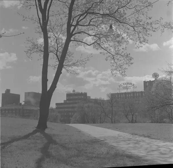 park, trær, Rådhuset, forretningsgårder, Odd Fellow-gården, Thorsted-gården, "skyline"