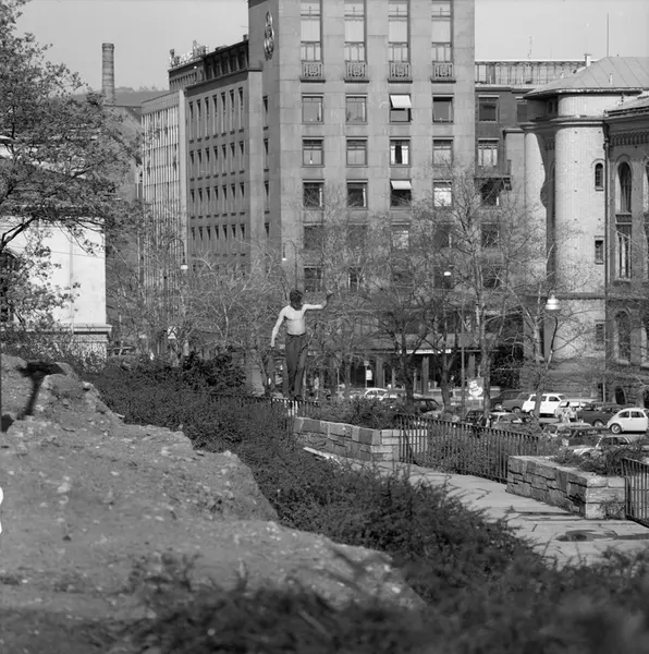 park, rekkverk, mann, balansekunst, kontorbygning, Historisk Museum, parkeringsplass, biler, Kjemibygningen