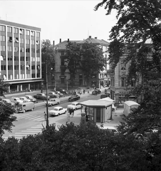 gateløp, kontorbygning, Texacogården, Homansbyen postkontor, bygårder, bokhandel, parkeringsplass, biler, kiosk
