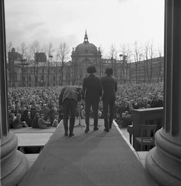 Universitetsplassen, moteshow, podium, konsert, popgruppe The Key Brothers, publikum, søyler, Nationaltheatret