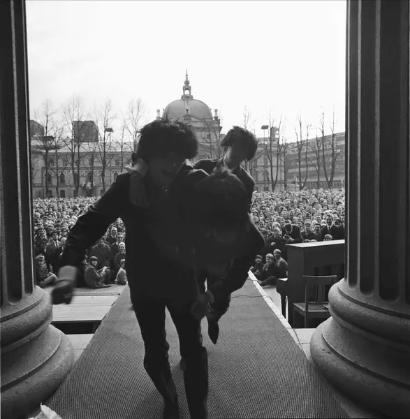 Universitetsplassen, moteshow, podium, konsert, popgruppe The Key Brothers, publikum, søyler, Nationaltheatret