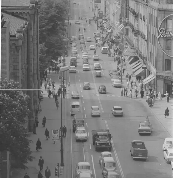 gateløp, biler, Bedford lastebil, mennesker, gateliv, Stortingsbygningen, Grand Hotel, forretningsgårder