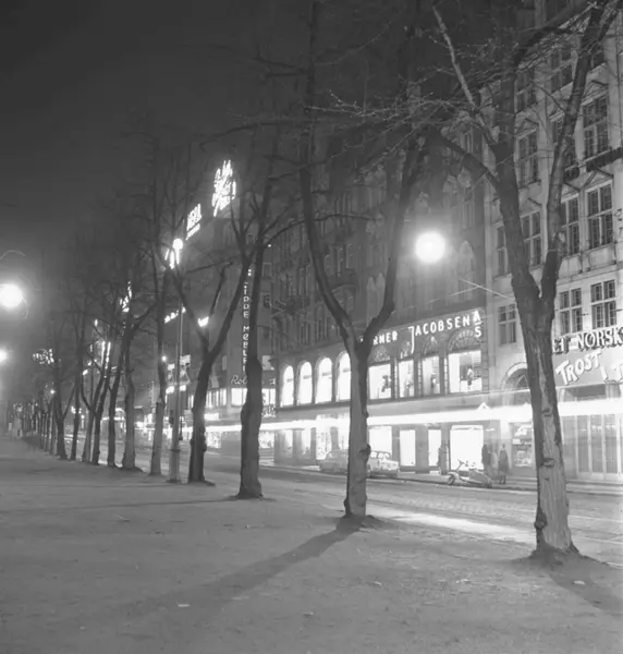 nattstille gate, nattemørke, fortau, trær, forretningsgårder, Det Norske Teatret, Ferner Jacobsen, biler, lysreklame