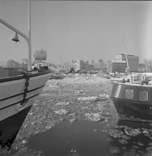 havn, islagt fjord, båter, lastebiler, dumping av snø i fjorden, Vestbanestasjonen, forretningsgårder