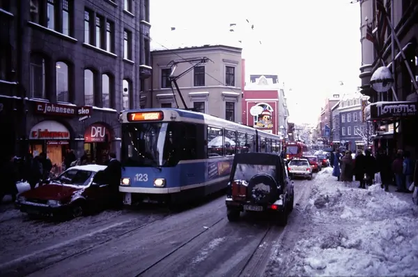 gateløp, trikker, biler, forretningsgårder, Norrøna hotell, snø