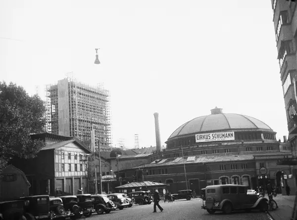 Cirkusbygningen, Cirkus Schumann, biler, mennesker, Røde Mølle, Rådhuset, byggevirksomhet, stillas