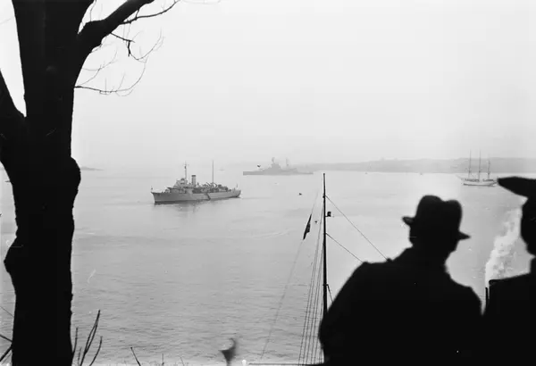 Dronning Mauds båre ble bragt hjem ombord på det britiske slagskipet HMS Royal Oak. Dette kan sees i bakgrunnen. Nærmest ser vi mineleggeren Olav Tryggvason.