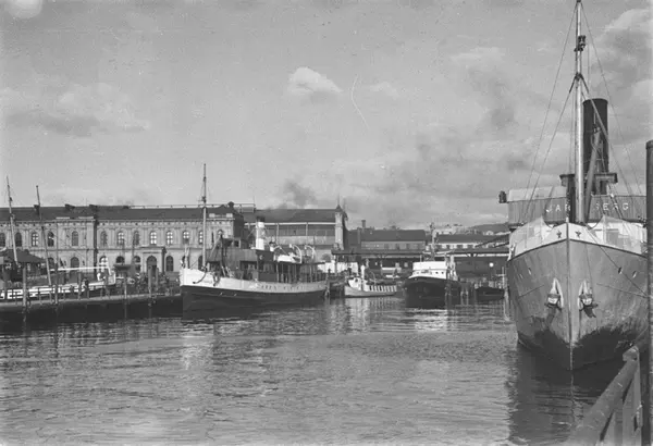D/S Jarlsberg i høyre billedkant, D/S Oksvald ligger ved Flytebryggen midt i bildet. Helt til venstre i bildet ser vi litt av D/S Angelo.