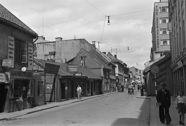 gateløp, mennesker, gateliv, trehusbebyggelse, bygårder, forretninger, Frelsesarmeens kontorbygning