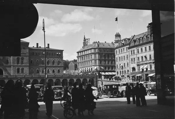 torg, mennesker, biler, forretningsgårder, basarer, politistasjon, Folkets Hus