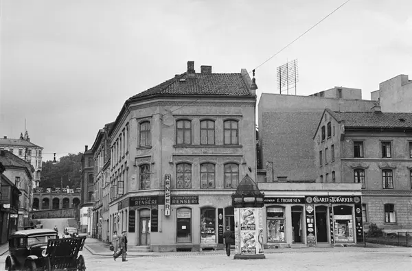 bygårder, Klingenberg renseri, E. Thorsen tobakksforretning, plakatsøyle, biler, mennesker