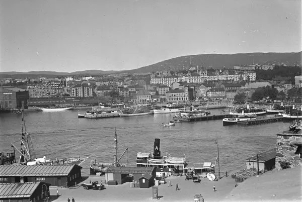 Ved Akershusutstikkeren ligger kystruteskipet D/S "Dronningen", eiet av Arendals Dapskipsselskap, og til høyre D/S "Alpha", bygget i 1904 og i rute fram til 1940.